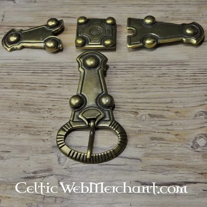 Dieser Gürtelbeschlag ist eine Nachbildung eines Satzes in Grab 2 in Balingen ausgegraben. Gürtel wie diese wurden von allen Germanen zwischen dem 5. und 6. Jahrhundert getragen. Ähnliche Originale wurden in einer großen Vielfalt.