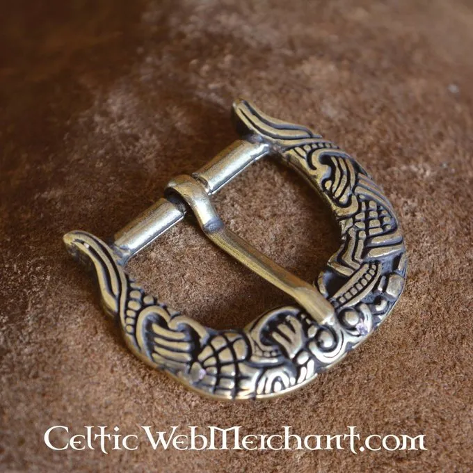 Die Viking Schnalle basiert auf Motive in zwei Viking Kunststilen aus dem 9. bis 10. Jahrhundert. Es ist geeignet für Gurtbänder mit einer Breite von 3 cm und misst 4,5 x 4,5 cm. Es ist bronzefarben.