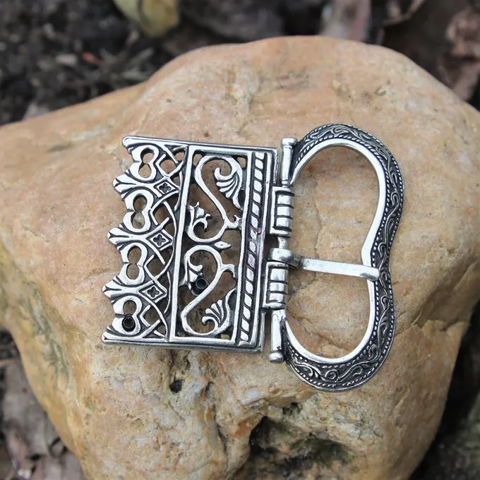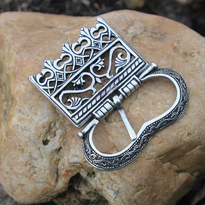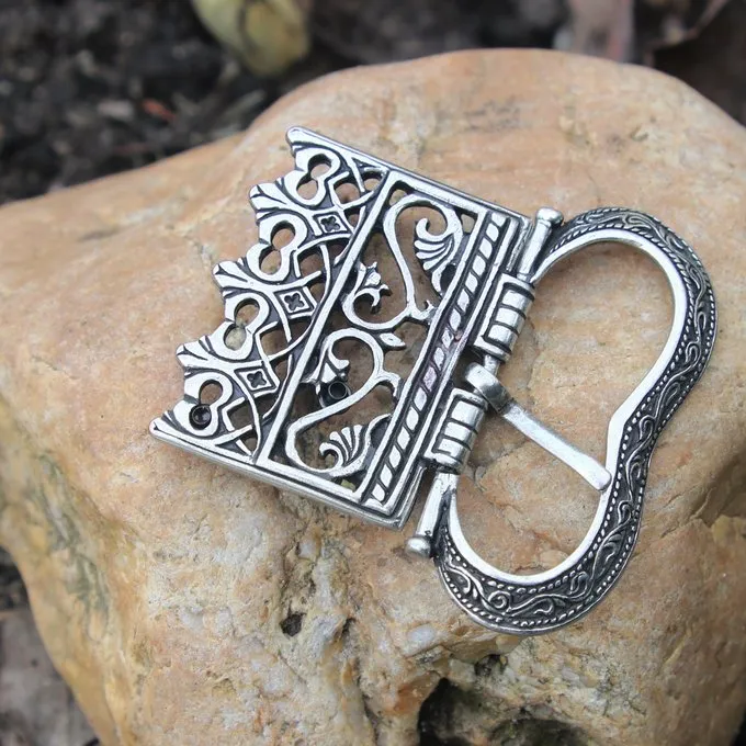 Diese Schnalle ist eine Nachbildung eines Originals auf dem Kunstwerk: „Porträt einer Dame“ des flämischen 15. Jahrhunderts Künstler Rogier van der Weyden. Schnallen wie diese wurden in Burgund, Flandern und Frankreich um das 15. Jahrhundert getragen. Sie wurden sowohl von Männern und Frauen getragen. Diese Schnalle ist aus Zinkdruckguss. Er misst 7,5 x 7 cm und ist für Riemen mit einer Breite von bis zu 5 cm geeignet. Diese Schnalle ist mit Ausnahme von einem Bandende geliefert.