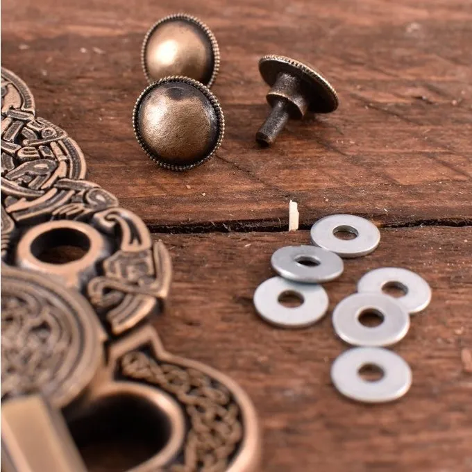Dies ist eine sehr detaillierte Rekonstruktion von der Großen Goldschnalle von Sutton Hoo. Das Original wurde im frühen 7.en Jahrhundert mit seinem Besitzer in einem Schiff-Begräbnis, zusammen mit mehreren Artefakte, wie der berühmten Sutton Hoo Helm begraben. Es ist derzeit auf dem Display im Britischen Museum in London. Die Schnalle ist aus Messing gefertigt. Es ist mit Nieten und Unterlegscheiben zur Befestigung geliefert.