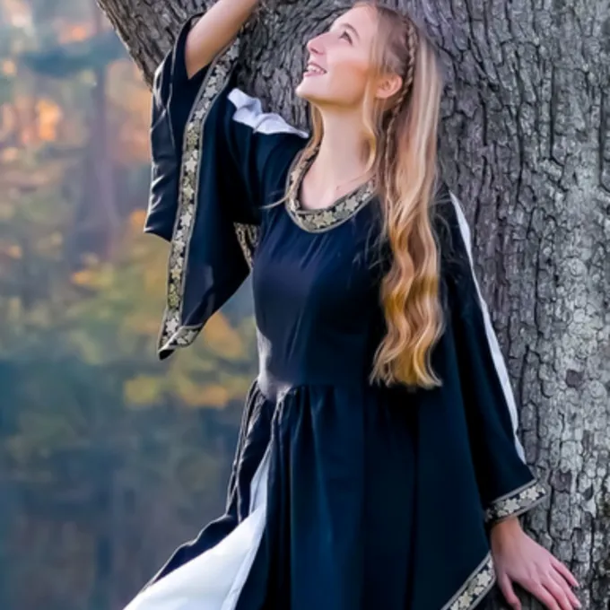 Dieses schöne Kleid ist für eine Adelige Form. Die elegant gestickten Details an den Ärmeln und am Kragen verleihen dem Kleid einen königlichen Look. Andere königliche Details sind die weißen Splits in dem weiten Trompetenärmel und die Vorderseite des Kleides