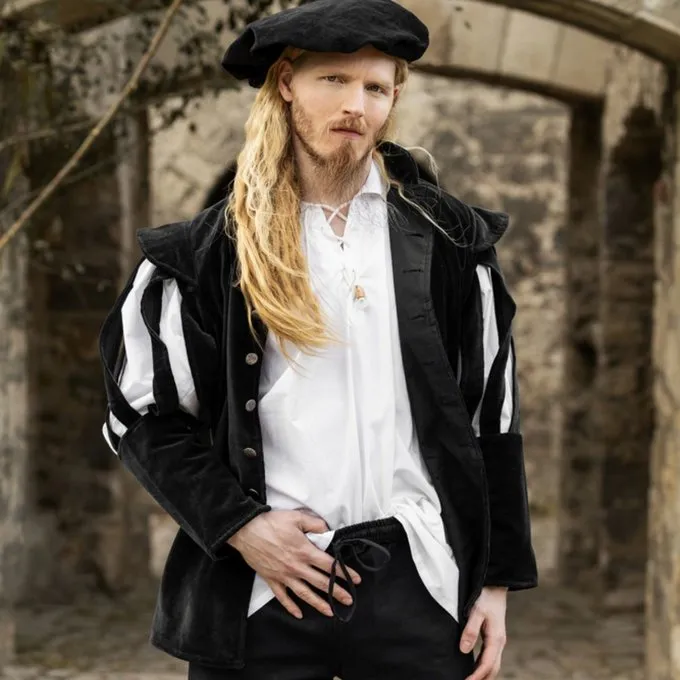 Diese Jacke ist aus Samt gefertigt und hat offene Ärmel. Es ist gefüttert und hat kein Gewebe zwischen den Hülsenöffnungen. Die Ärmel können mit Korden geschlossen werden, und die Vorderseite kann mit Knöpfen geschlossen werden.