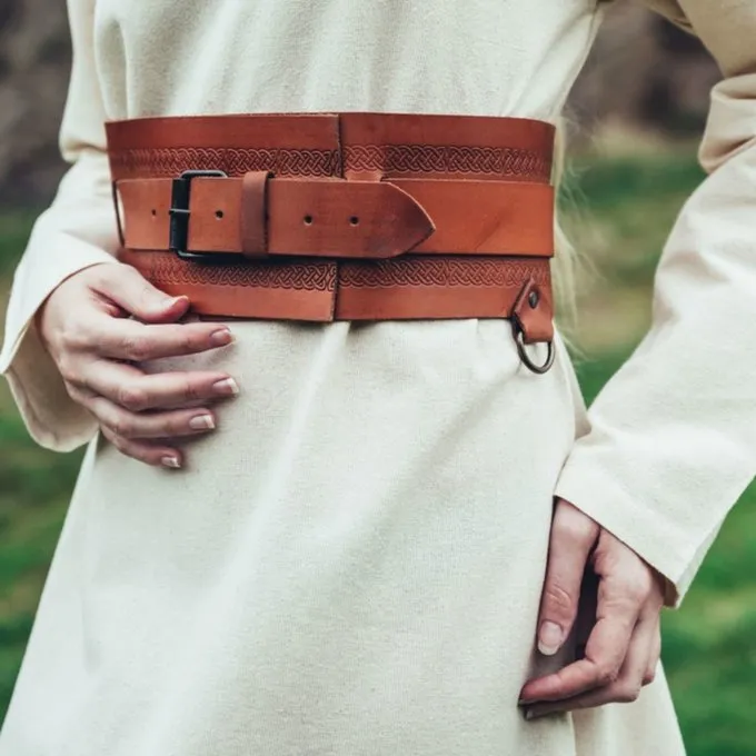 Dieser breite Taillengurt ist mit einem schönen heidnischen Knotenmuster dekoriert und in verschiedenen Größen erhältlich. Es eignet sich sowohl für Tunika als auch für Kleider. Ein schönes Accessoire für Ihr Viking-Outfit, Valkyre-Kostüm, Larp-Figuren und Insta-Fotos. Da Sie diesen Gürtel an der Größe anpassen können, gibt es sofort ein elegantes Fit. Der Gürtel hat 3 Ringe, auf denen Sie Zubehör wie einen Waffenhalter oder eine Tasche aufhängen können. Sie können den Riemen 15 cm enger tragen als die gewählte Größe. Beispielsweise ist Größe 100 cm bis zu 85 cm einstellbar.